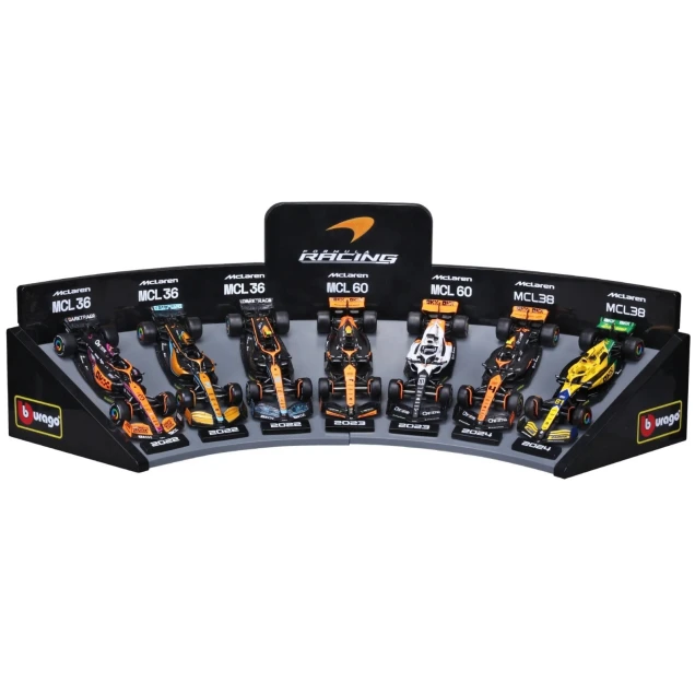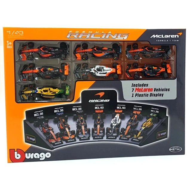 - O conjunto inclui: 7 carros McLaren de Fórmula 1 + 1 suporte de plástico para exibição