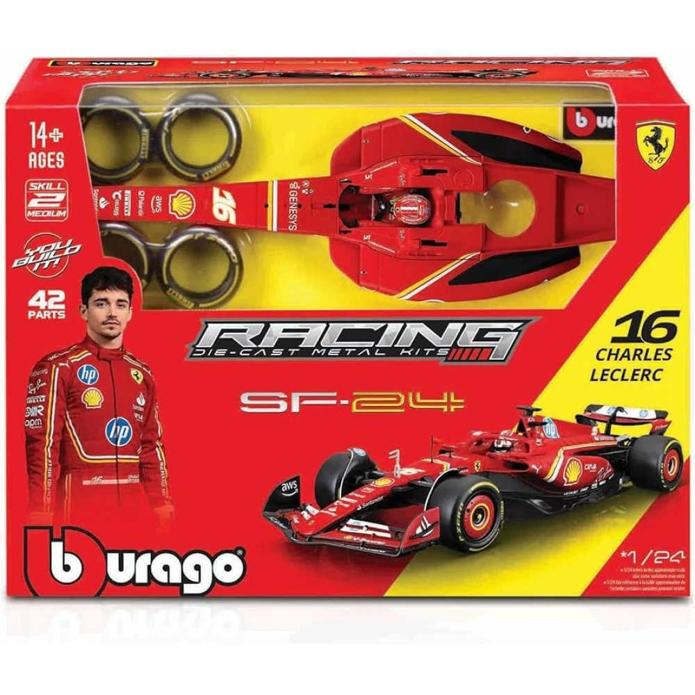 Monte o seu próprio carro de Fórmula 1 com o exclusivo Kit de Montagem Ferrari SF-24 da Bburago, em escala 1:24. Este kit reproduz o modelo oficial da temporada 2024, guiado por Charles Leclerc (#16), com pintura e detalhes realistas da equipe Ferrari. O conjunto inclui 41 peças em metal die-cast e plástico de alta qualidade, que proporcionam uma experiência divertida, interativa e educativa de montagem. Após concluído, o resultado é uma miniatura detalhada e robusta, perfeita para exibição ou coleção.
